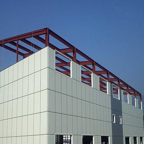⊙ 조립식 건물 - 철골공사 : 건축물의 뼈대로 쓰이는 구조재로 여러 가지 종류의 철강 재료를 이용하고, 리벳, 볼트 또는 용접 등의 방법으로 조립하는 구조. 철근 콘크리트와 함께 사용되는 것을 철골 철근 콘크리트 구조라고 한다. [네이버출처]
